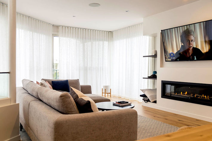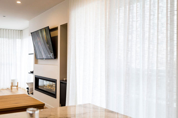Living/Dining/Kitchen – Gummerson Cloud Snow – Sheer S Fold Curtains line all exterior glazed walls creating a soft yet private partition